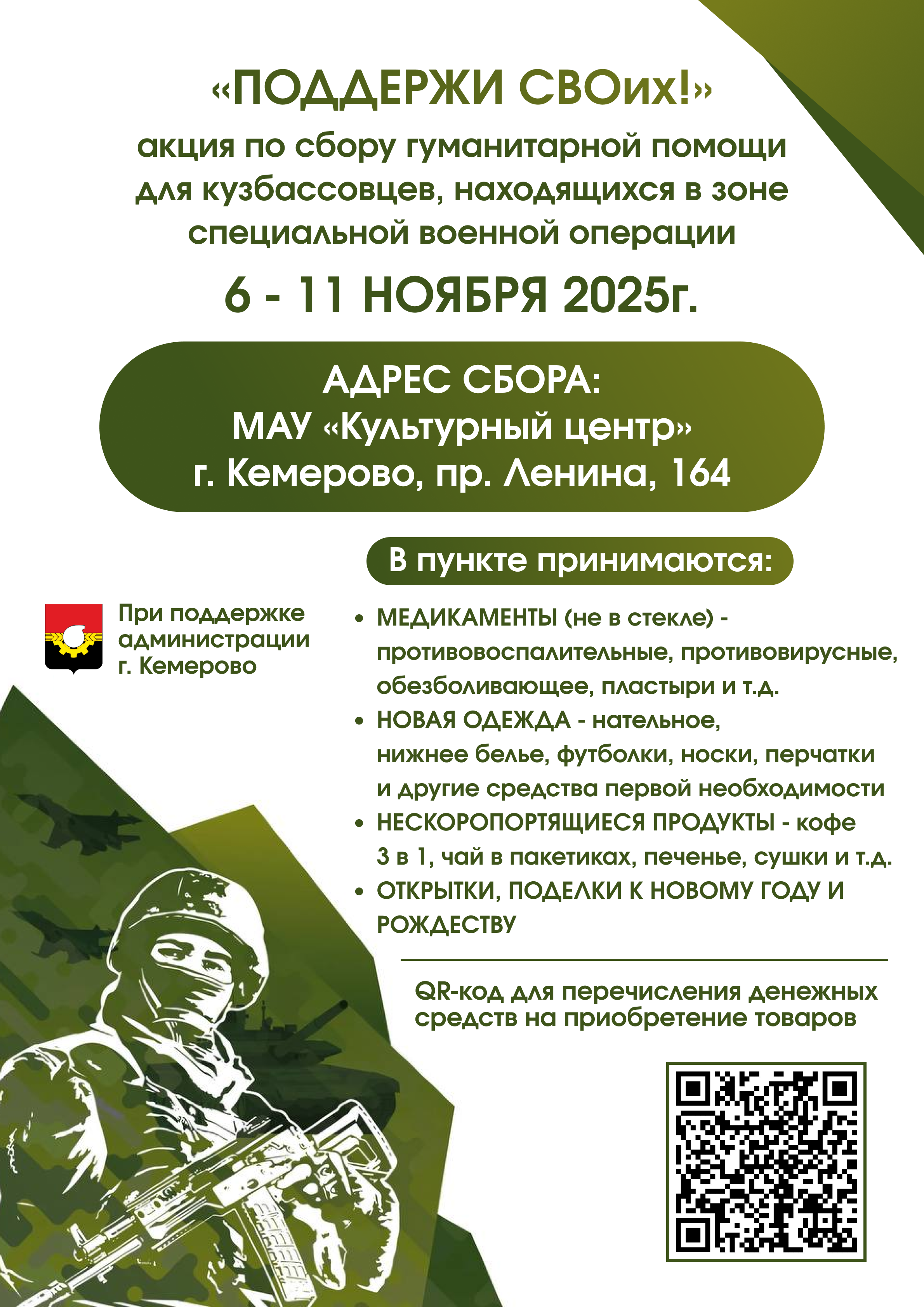 Акция «Поддержи СВОих!» С 6 по 11 ноября 2025 года (с 09:00 до 21:00 час.) в МАУ «Культурный центр» (г. Кемерово, пр. Ленина, 164) пройдет акция по сбору гуманитарной помощи для...
