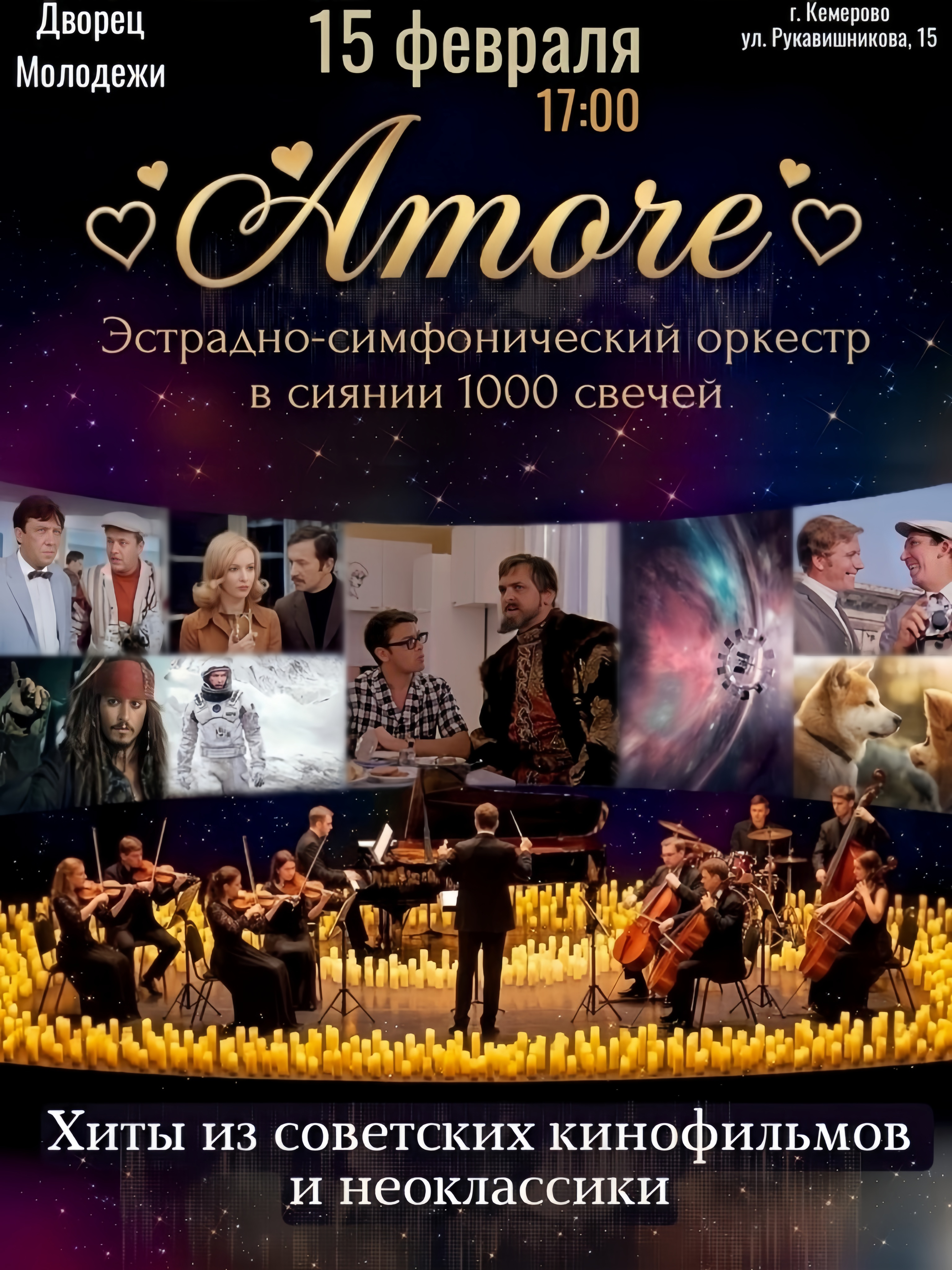 AMORE: Эстрадно-Симфонический Оркестр в Сиянии 1000 Свечей Дата: 15 февраля в 17:00 Погружение в волшебную атмосферу симфонии, любви и искусства под живое звучание и мягкое мерцание...